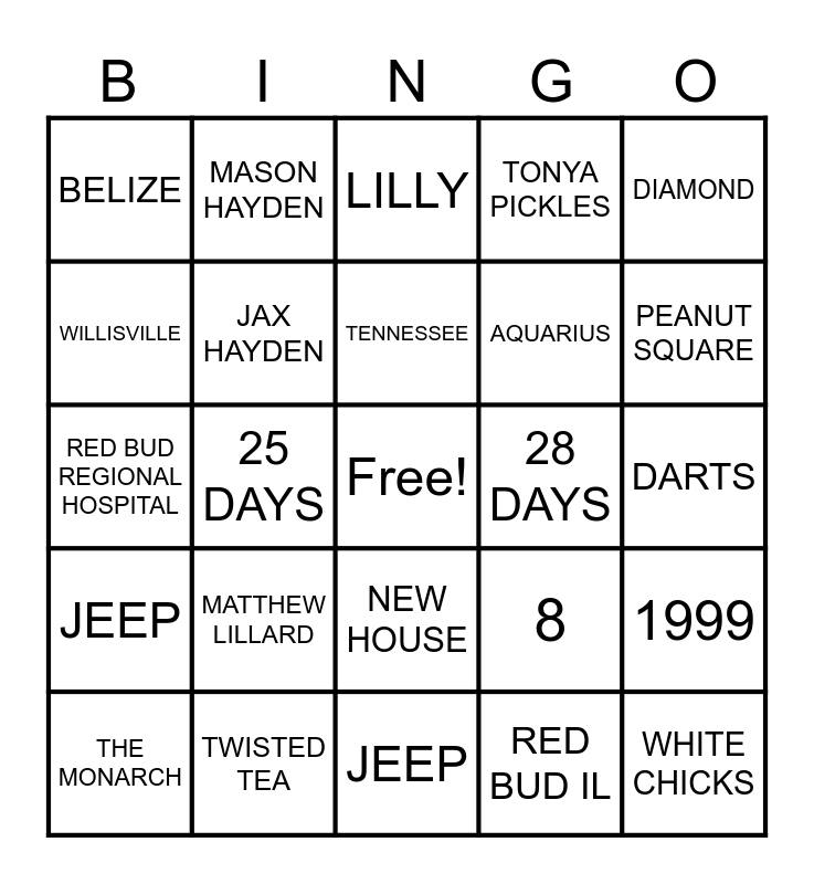 ⚠ This card has duplicate items: PIONEERS (2), 8 (2), TWISTED TEA (2), 1999 (2), RED BUD REGIONAL HOSPITAL (2), RED BUD IL (2), MASON HAYDEN (2), JAX HAYDEN (2), TENNESSEE (2), 28 DAYS (2), NEW HOUSE (2), 5 YEARS (2), DARTS (2), PEANUT SQUARE (2), WILLISVILLE (2), 25 DAYS (2), BELIZE (2), DOG (2), AQUARIUS (2), MATTHEW LILLARD (2), JEEP (2), TONYA PICKLES (2), 3 YEARS (2), GREEN DAY (2), LILLY (2), 5 1/2 (2), 6 1/2 (2), WHITE CHICKS (2), BROWN (2), THE MONARCH (2), WINE TRAIL (2), 5 (2)