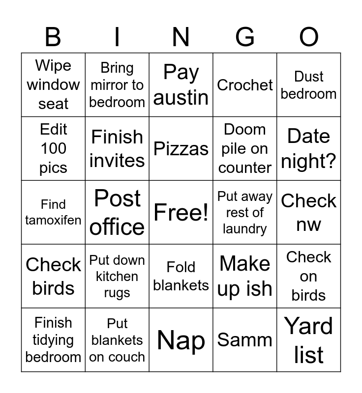 This bingo card has a free space and 24 words: Put down kitchen rugs, Put blankets on couch, Pizzas, Finish tidying bedroom, Dust bedroom, Wipe window seat, Edit 100 pics, Bring mirror to bedroom, Put away rest of laundry, Fold blankets, Doom pile on counter, Find tamoxifen, Make up ish, Check on birds, Finish invites, Samm, Check nw, Pay austin, Date night?, Post office, Yard list, Check birds, Crochet and Nap.