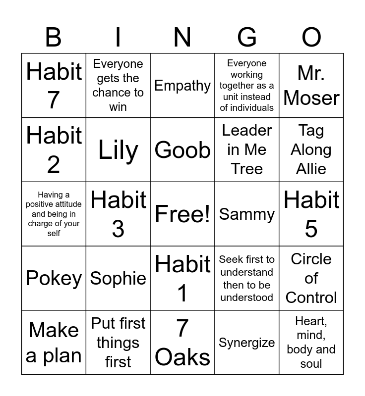 This bingo card has a free space and 26 words: Habit 1, Synergize, Goob, Put first things first, Mr. Moser, Habit 7, Habit 2, Everyone gets the chance to win, Habit 5, Seek first to understand then to be understood, Leader in Me Tree, Having a positive attitude and being in charge of your self, Circle of Control, Make a plan, Habit 3, Jumper, Everyone working together as a unit instead of individuals, Pokey, Empathy, Heart, mind, body and soul, Tag Along Allie, 7 Oaks, Sammy, Sophie, Lily and Read a book or color.