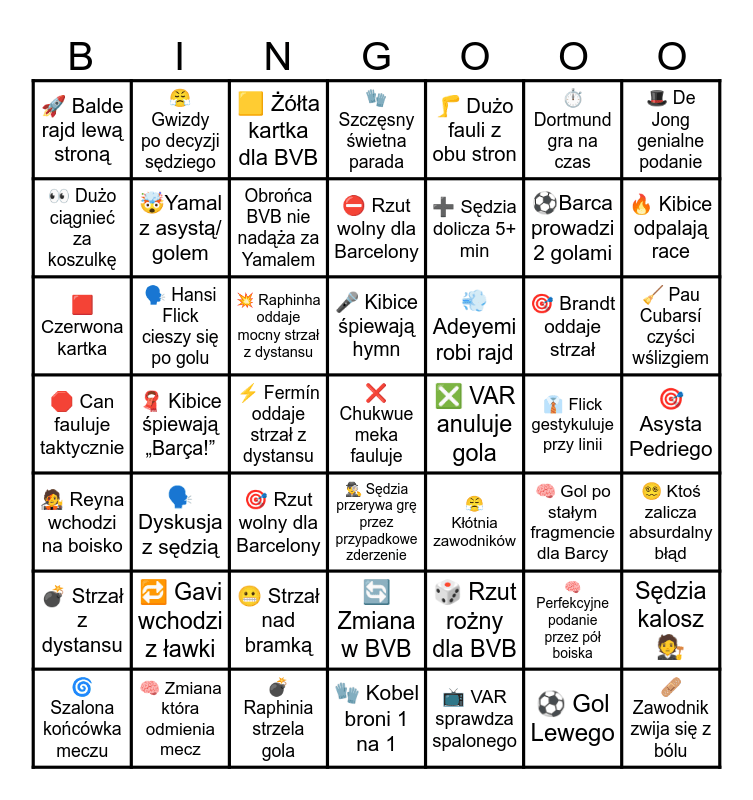 This bingo card has a free space and 48 words: 🎲 Rzut rożny dla BVB, ⚽Barca prowadzi 2 golami, 🧤 Kobel broni 1 na 1, 🧣 Kibice śpiewają „Barça!”, 💥 Raphinha oddaje mocny strzał z dystansu, 🎯 Asysta Pedriego, 😤 Gwizdy po decyzji sędziego, 🧠 Zmiana która odmienia mecz, ⏱️ Dortmund gra na czas, 🕵️♂️ Sędzia przerywa grę przez przypadkowe zderzenie, 🎩 De Jong genialne podanie, 🧤Szczęsny świetna parada, 🎯 Brandt oddaje strzał, 💨 Adeyemi robi rajd, 💣 Strzał z dystansu, 👔 Flick gestykuluje przy linii, 👀 Dużo ciągnieć za koszulkę, 🔥 Kibice odpalają race, 🧠 Perfekcyjne podanie przez pół boiska, 🦵 Dużo fauli z obu stron, ➕ Sędzia dolicza 5+ min, ⚡ Fermín oddaje strzał z dystansu, 🚀 Balde rajd lewą stroną, 🤯Yamal z asystą/ golem, Sędzia kalosz 🧑⚖️, Obrońca BVB nie nadąża za Yamalem, 🧹 Pau Cubarsí czyści wślizgiem, 🌀 Szalona końcówka meczu, 🎤 Kibice śpiewają hymn, 🗣️ Hansi Flick cieszy się po golu, ⚽ Gol Lewego, ❎ VAR anuluje gola, 😵💫 Ktoś zalicza absurdalny błąd, 🔁 Gavi wchodzi z ławki, 🛑 Can fauluje taktycznie, 😤 Kłótnia zawodników, 🧠 Gol po stałym fragmencie dla Barcy, 🟥 Czerwona kartka, 🎯 Rzut wolny dla Barcelony, 😬 Strzał nad bramką, 🧑🎤 Reyna wchodzi na boisko, 🩹 Zawodnik zwija się z bólu, 🟨 Żółta kartka dla BVB, 💣 Raphinia strzela gola, ⛔ Rzut wolny dla Barcelony, 🔄 Zmiana w BVB, 🗣️ Dyskusja z sędzią and 📺 VAR sprawdza spalonego.