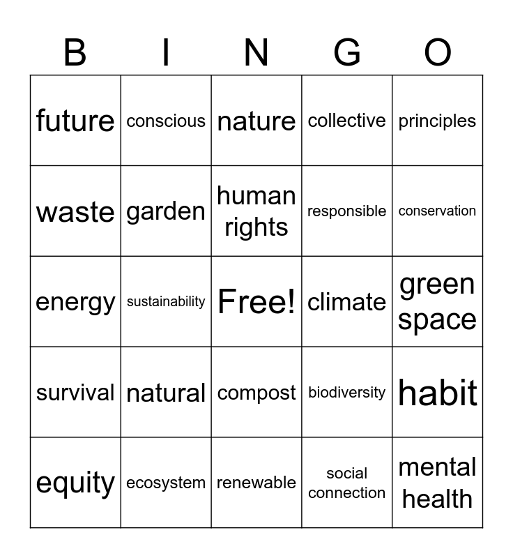 This bingo card has a free space and 30 words: ecosystem, consumption, sustainability, environment, future, nature, garden, compost, climate, renewable, green space, mental health, social connection, well-being, conservation, pollution, biodiversity, survival, natural, principles, energy, healthy, conscious, responsible, waste, collective, habit, equity, human rights and circular economy.