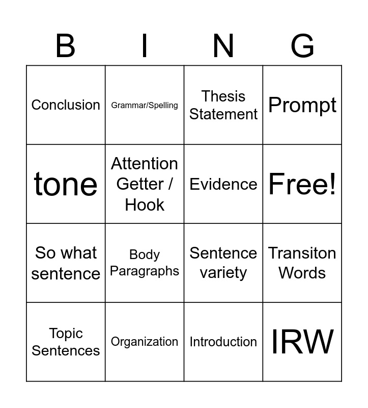 This bingo card has 17 words: Introduction, Topic Sentences, Thesis Statement, Conclusion, Body Paragraphs, Prompt, Transiton Words, Evidence, Free!, Attention Getter / Hook, Organization, Sentence variety, tone, Grammar/Spelling, So what sentence, Bridge and IRW.