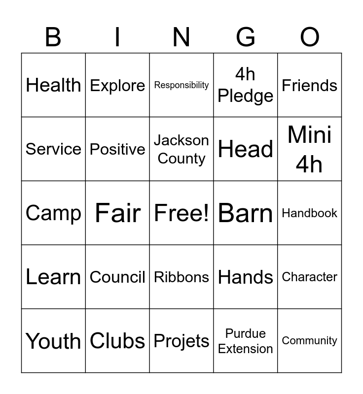 This bingo card has a free space and 29 words: Youth, Heart, Fair, Leadership, Health, Responsibility, Positive, Council, Barn, Clubs, Handbook, Community, Projets, Purdue Extension, Mini 4h, Animals, Ribbons, Learn, Friends, Camp, Hands, Demonstrations, Head, Service, 4h Pledge, Explore, Character, Jackson County and Fundraisers.