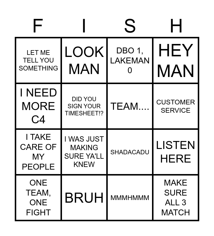 This bingo card has 16 words: BRUH, LISTEN HERE, DBO 1, LAKEMAN 0, LET ME TELL YOU SOMETHING, I TAKE CARE OF MY PEOPLE, LOOK MAN, SHADACADU, MMMHMMM, I NEED MORE C4, DID YOU SIGN YOUR TIMESHEET!?, ONE TEAM, ONE FIGHT, HEY MAN, I WAS JUST MAKING SURE YA'LL KNEW, CUSTOMER SERVICE, TEAM.... and MAKE SURE ALL 3 MATCH.