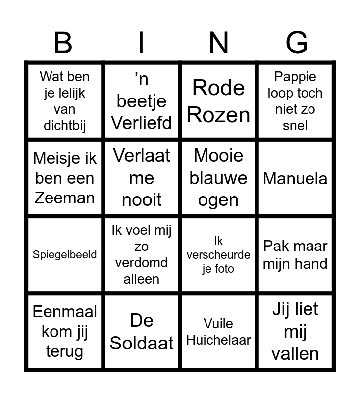 This bingo card has 42 words: Laat me alleen, Manuela, Rozen voor Sandra, Ein Festival der Liebe, Waarom Fluister ik je naam nog, Patsy, Eenmaal kom jij terug, Brandend Zand, Rode Rozen, Huilen is voor jou te Laat, Vuile Huichelaar, Ik voel mij zo verdomd alleen, Pak maar mijn hand, Meisje ik ben een Zeeman, Keetje Tippel, Morgen Ben ik de Bruid, ’n Sneeuwwitte Bruidsjurk, Ik verscheurde je foto, Je hebt me belazerd, ’n beetje Verliefd, Verlaat me nooit, Laat me nu toch niet alleen, Eens schijnt weer de zon, Wat ben je lelijk van dichtbij, Och was ik maar, Kleine Zigeunerin, Spiegelbeeld, Rockey, Er valt een traan in mijn bier, Santa Maria, Waarom heb je mij laten staan, Jij liet mij vallen, Mooie blauwe ogen, Amore Mio, Ik heb de hele nacht liggen dromen, Verdammt ich Lieb Dich, Zij gelooft in mij, De Soldaat, Ik doe wat ik doe, Mexico, Pappie loop toch niet zo snel and Kleine Vogel.