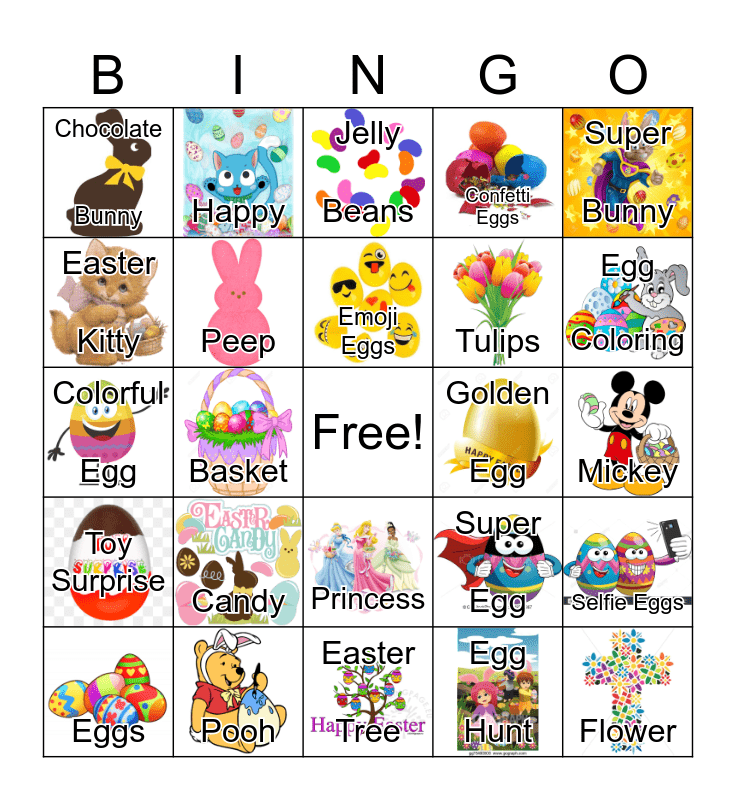 This bingo card has 29 images, a free space and 29 words: Eggs, Easter Bunny, Basket, Chick, Chocolate Bunny, Jelly Beans, Peep, Candy, Golden Egg, Pooh, Mickey, Flower, Easter Tree, Egg Hunt, Egg Coloring, Pokemon, Princess, Toy Surprise, Super Bunny, Colorful Egg, Super Egg, Eeyore, Tulips, Easter Kitty, Confetti Eggs, Happy, Selfie Eggs, Emoji Eggs and Plastic Eggs.