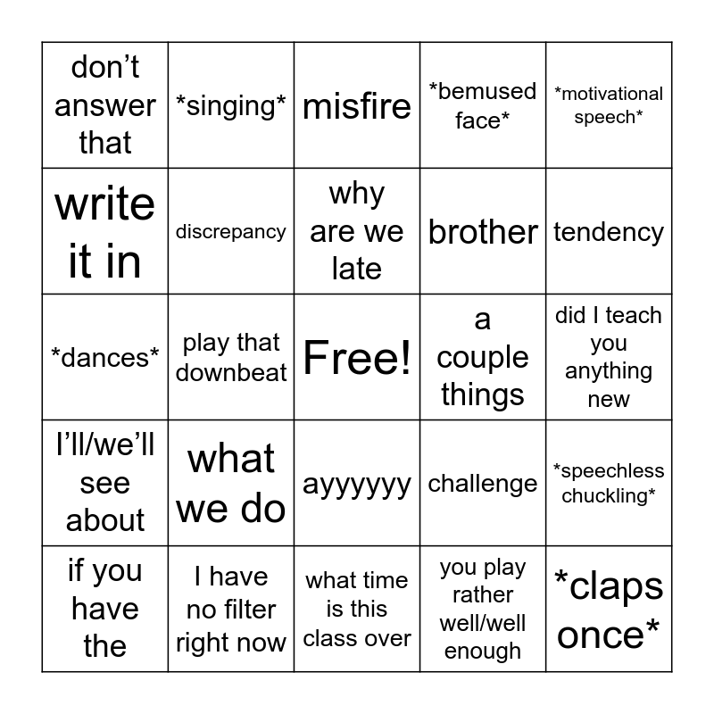 This bingo card has a free space and 30 words: I have no filter right now, what I’d like (us/you) to do, play that downbeat, academic why, don’t answer that, misfire, discrepancy, ayyyyyy, a couple things, what time is this class over, did I teach you anything new, *claps once*, you play rather well/well enough, frontloading, tendency, try something, challenge, I’ll/we’ll see about, what we do, *motivational speech*, *dances*, *slow blink*, *singing*, brother, write it in, *bemused face*, *speechless chuckling*, if you have the, why are we late and *leans back and crosses arms*.