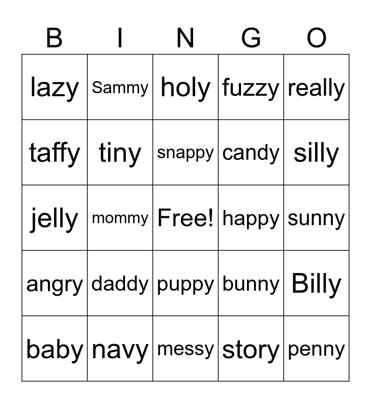 This bingo card has a free space and 29 words: baby, funny, mommy, lady, lazy, holy, tiny, daddy, happy, navy, sunny, penny, messy, story, silly, smelly, puppy, angry, really, jelly, bunny, Sally, candy, taffy, fuzzy, Sammy, Billy, snappy and stuffy.