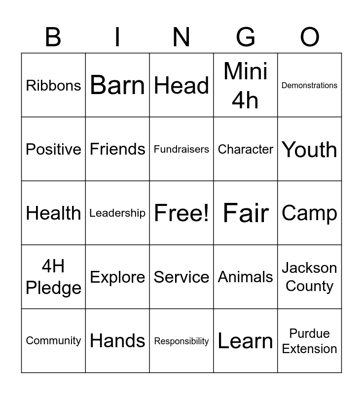 This bingo card has a free space and 29 words: Community, Clubs, Leadership, Projects, Ribbons, Head, Friends, Explore, Fair, Hands, Camp, Purdue Extension, Responsibility, Learn, Youth, Handbook, Service, 4H Pledge, Demonstrations, Health, Animals, Heart, Character, Positive, Mini 4h, Barn, Jackson County, Fundraisers and Council.