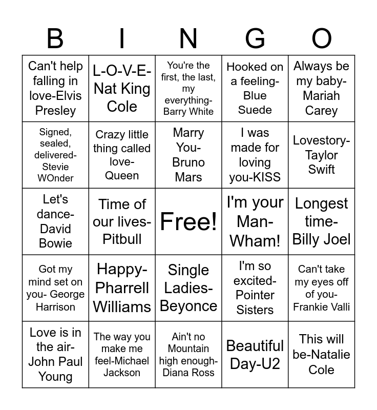 This bingo card has a free space and 50 words: Chapel of love-Dixie Cups, This will be-Natalie Cole, Another one bites the dust-Queen, Ain't no Mountain high enough-Diana Ross, Happy-Pharrell Williams, Let's stay together- Al Green, L-O-V-E- Nat King Cole, Grow old with you-Adam Sandler, Signed, sealed, delivered- Stevie WOnder, Never Gonna give you up-Rick Astlye, Crazy little thing called love- Queen, Hooked on a feeling- Blue Suede, Can't take my eyes off of you-Frankie Valli, I'm so excited- Pointer Sisters, All you need is love-The Beatles, Breathe-Faith Hill, Marry You-Bruno Mars, I'm your Man- Wham!, Forever & ever, Amen-Randy Travis, Always be my baby- Mariah Carey, Time of our lives-Pitbull, Beautiful Day-U2, Can't help falling in love-Elvis Presley, I was made for loving you-KISS, I wanna hold your hand-The Beatles, Dancing Queen- ABBA, Lovestory- Taylor Swift, You're the one that I want-John Travolta/Olivia Newton John/Grease, You're the first, the last, my everything-Barry White, Single Ladies- Beyonce, My Girl-Temptations, You make my dreams- Hall & Oates, Power of love-Huey Lewis, For once in my life-Stevie Wonder, The way you make me feel-Michael Jackson, Come & Get your love-Redbone, You got it-Roy Orbison, Kiss-Prince, Every little thing she does-Police, Longest time-Billy Joel, Don't worry be happy- Bobby McFarrin, Baby I love you're way-Big Mountain, You're the inspiration-Chicago, I got you babe-Sonny & Cher, Love is in the air-John Paul Young, Let's dance-David Bowie, Higher love-Steve Winwood, You can't hurry love- Phil Collins, Got my mind set on you- George Harrison and How sweet it is to be loved by you- James Taylor.