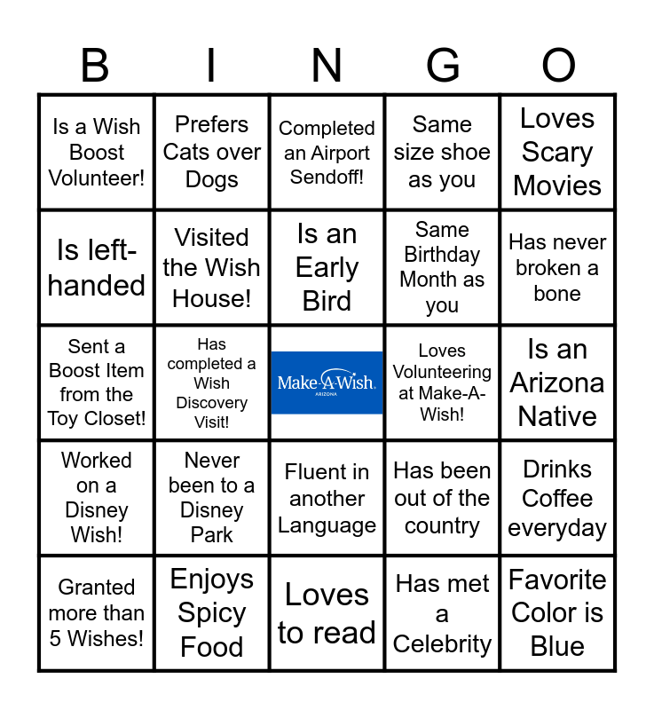 This bingo card has a free space and 24 words: Never been to a Disney Park, Enjoys Spicy Food, Is an Early Bird, Granted more than 5 Wishes!, Loves Scary Movies, Is a Wish Boost Volunteer!, Is left-handed, Prefers Cats over Dogs, Loves Volunteering at Make-A-Wish!, Fluent in another Language, Same Birthday Month as you, Sent a Boost Item from the Toy Closet!, Has been out of the country, Drinks Coffee everyday, Visited the Wish House!, Has met a Celebrity, Is an Arizona Native, Completed an Airport Sendoff!, Has never broken a bone, Has completed a Wish Discovery Visit!, Favorite Color is Blue, Worked on a Disney Wish!, Same size shoe as you and Loves to read.