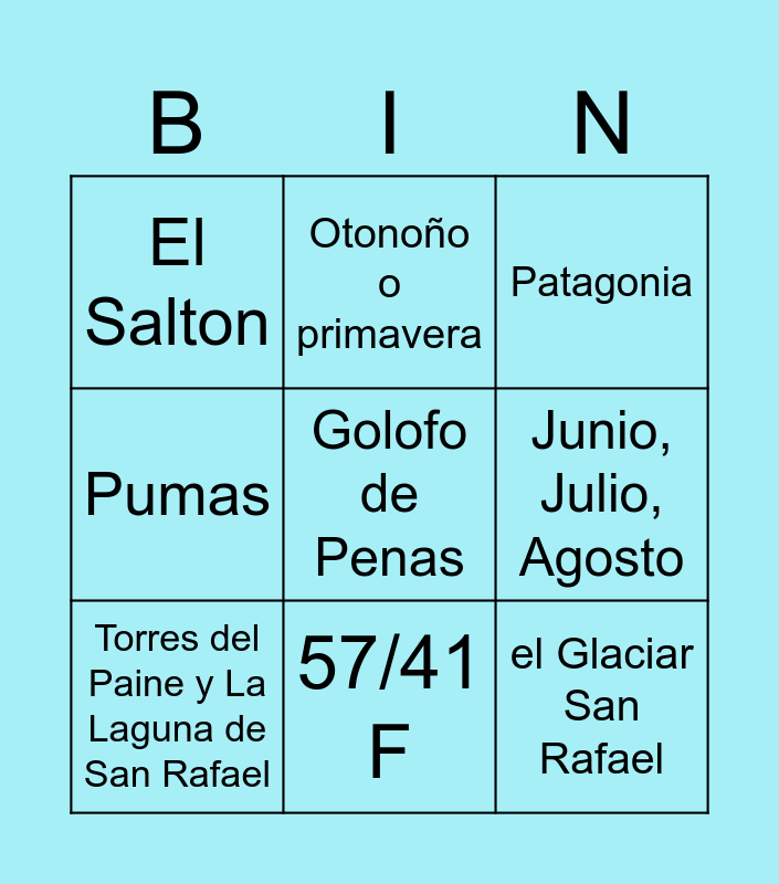 This bingo card has 9 words: Torres del Paine y La Laguna de San Rafael, Patagonia, Otonoño o primavera, Pumas, El Salton, Junio, Julio, Agosto, Golofo de Penas, el Glaciar San Rafael and 57/41 F.