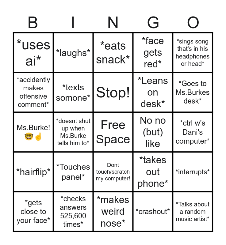 This bingo card has a free space and 29 words: *gets close to your face*, *plays games on computer or phone*, *doesnt shut up when Ms.Burke tells him to*, *walks around*, *uses ai*, *eats snack*, *texts somone*, *Touches panel*, No no (but) like, *checks answers 525,600 times*, *ctrl w's Dani's computer*, *Talks about a random music artist*, *makes weird nose*, *crashout*, *Goes to Ms.Burkes desk*, *takes out earbuds from bag*, Dont touch/scratch my computer!, *hairflip*, *sings song that's in his headphones or head*, Ms.Burke!🤓☝️, *takes out phone*, Walmart Earbuds, *Leans on desk*, *accidently makes offensive comment*, *face gets red*, *laughs*, *interrupts*, Stop! and Brooooooo.