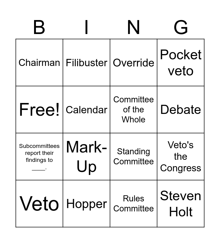 This bingo card has 16 words: Hopper, Veto's the Congress, Override, Chairman, Subcommittees report their findings to ____., Filibuster, Standing Committee, Rules Committee, Free!, Calendar, Veto, Pocket veto, Mark-Up, Debate, Committee of the Whole and Steven Holt.