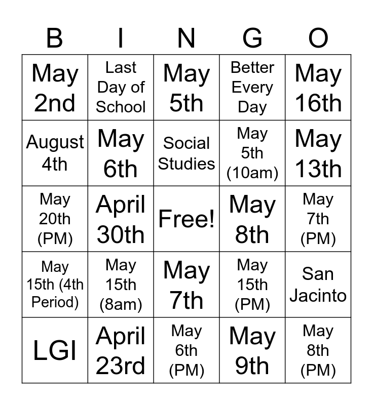 This bingo card has a free space and 30 words: April 23rd, April 29th, April 30th, May 1st, May 2nd, May 5th, May 6th, May 7th, May 8th, May 6th (PM), May 7th (PM), May 8th (PM), May 9th, May 12th, May 13th, May 6th (after orchestra), May 15th (PM), May 15th (4th Period), May 15th (8am), May 16th, May 20th (PM), May 20th (AM), Last Day of School, May 5th (10am), August 4th, Better Every Day, San Jacinto, LGI, Social Studies and Math.