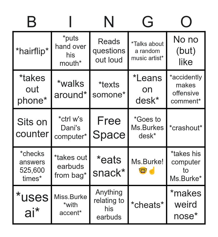This bingo card has a free space and 39 words: *gets close to your face*, *plays games on computer or phone*, *doesnt shut up when Ms.Burke tells him to*, *walks around*, *uses ai*, *eats snack*, *texts somone*, *Touches panel*, No no (but) like, *checks answers 525,600 times*, *ctrl w's Dani's computer*, *Talks about a random music artist*, *makes weird nose*, *crashout*, *Goes to Ms.Burkes desk*, *takes out earbuds from bag*, Dont touch/scratch my computer!, *hairflip*, *sings song that's in his headphones or head*, Ms.Burke!🤓☝️, *takes out phone*, Anything relating to his earbuds, *Leans on desk*, *accidently makes offensive comment*, *face gets red*, *laughs*, *interrupts*, Stop!, Brooooooo, *puts hand over his mouth*, *hits table*, Talks about being in tech, Reads questions out loud, Miss.Burke *with accent*, *cheats*, *drinks water*, *takes his computer to Ms.Burke*, Sits on counter and *leans back in chair*.