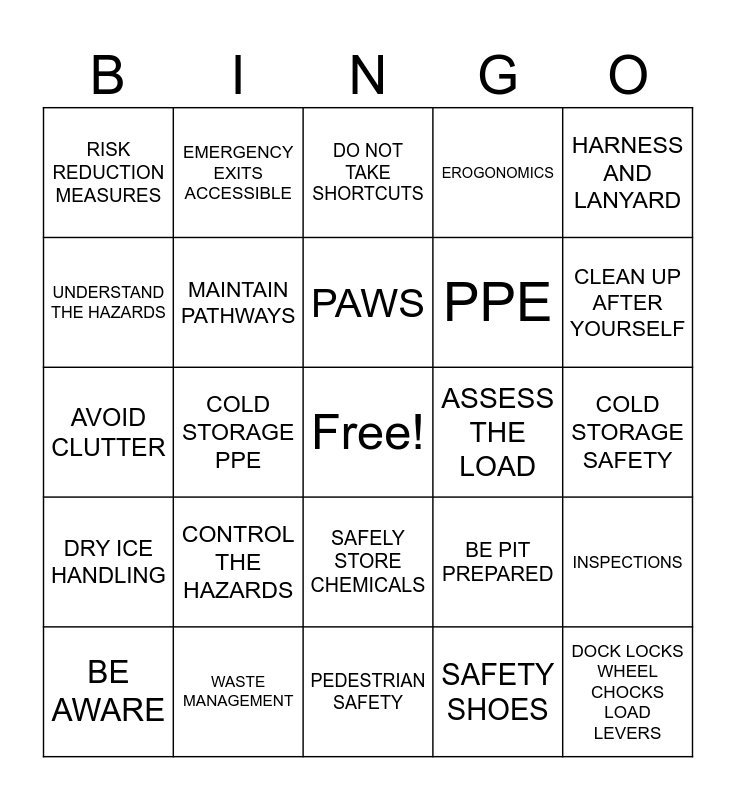This bingo card has a free space and 24 words: CONTROL THE HAZARDS, WASTE MANAGEMENT, PAWS, BE AWARE, HARNESS AND LANYARD, RISK REDUCTION MEASURES, UNDERSTAND THE HAZARDS, EMERGENCY EXITS ACCESSIBLE, ASSESS THE LOAD, SAFELY STORE CHEMICALS, PPE, AVOID CLUTTER, BE PIT PREPARED, INSPECTIONS, MAINTAIN PATHWAYS, SAFETY SHOES, COLD STORAGE SAFETY, DO NOT TAKE SHORTCUTS, CLEAN UP AFTER YOURSELF, COLD STORAGE PPE, DOCK LOCKS WHEEL CHOCKS LOAD LEVERS, DRY ICE HANDLING, EROGONOMICS and PEDESTRIAN SAFETY.