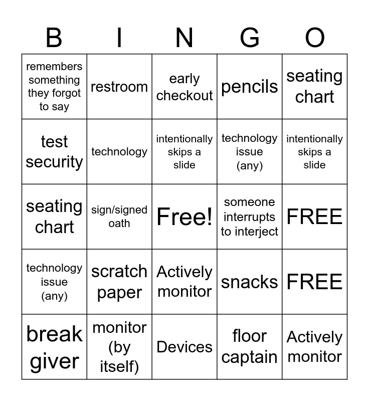 ⚠ This card has duplicate items: Someone asks question already answered (2), Actively monitor (2), Cell phones (2), Devices (2), scratch paper (2), early checkout (2), restroom (2), monitor (by itself) (2), test security (2), Chromebook check out (2), technology (2), pencils (2), FREE (2), snacks (2), water bottle (2), accidentally skips a slide (2), intentionally skips a slide (2), someone interrupts to interject (2), break giver (2), seating chart (2), sign/signed oath (2), floor captain (2), remembers something they forgot to say (2), technology issue (any) (2), Chromebook charger (must say both words) (2)
