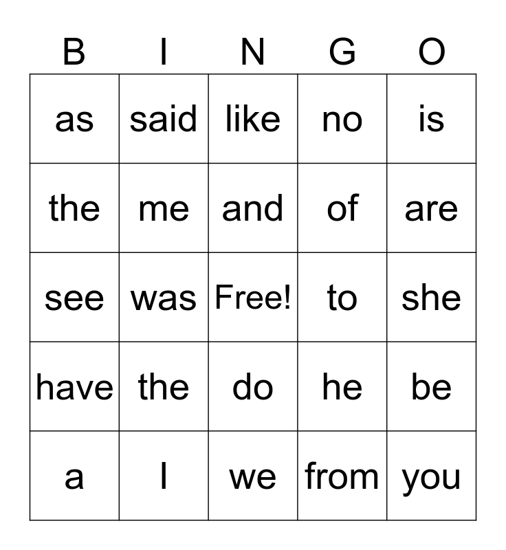 This bingo card has a free space and 24 words: the, I, and, a, is, as, the, said, to, do, of, see, he, be, me, from, she, like, are, was, you, have, no and we.