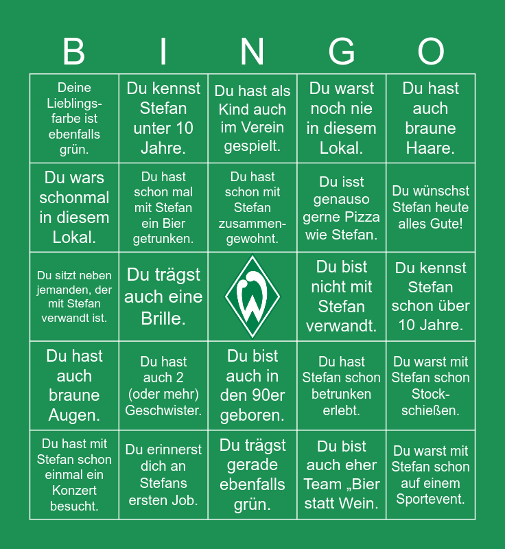 This bingo card has a free space and 29 words: Du hast mit Stefan schon einmal ein Konzert besucht., Du warst mit Stefan gemeinsam im Urlaub., Du trägst auch eine Brille., Du bist auch über 30 Jahre alt., Deine Lieblings-farbe ist ebenfalls grün., Du hast als Kind auch im Verein gespielt., Du hast schon mal mit Stefan ein Bier getrunken., Du hast auch 2 (oder mehr) Geschwister., Du bist nicht mit Stefan verwandt., Du erinnerst dich an Stefans ersten Job., Du kennst Stefan schon über 10 Jahre., Du warst mit Stefan schon auf einem Sportevent., Du trägst gerade ebenfalls grün., Du bist auch eher Team „Bier statt Wein., Du wünschst Stefan heute alles Gute!, Du hast auch im April Geburtstag., Du bist auch in den 90er geboren., Du hast auch braune Augen., Du hast auch braune Haare., Du sitzt neben jemanden, der mit Stefan verwandt ist., Du hast Stefan schon betrunken erlebt., Du bist mit Stefan verwandt., Du isst genauso gerne Pizza wie Stefan., Du wars schonmal in diesem Lokal., Du warst noch nie in diesem Lokal., Du kennst Stefan unter 10 Jahre., Du warst mit Stefan schon Stock-schießen., Du hast schon mit Stefan zusammen-gewohnt. and Du bist unter 30 Jahre alt..