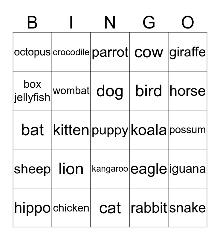 This bingo card has 25 words: lion, cat, dog, hippo, giraffe, octopus, box jellyfish, crocodile, koala, kangaroo, bird, bat, eagle, iguana, wombat, snake, possum, parrot, horse, kitten, puppy, chicken, sheep, cow and rabbit.