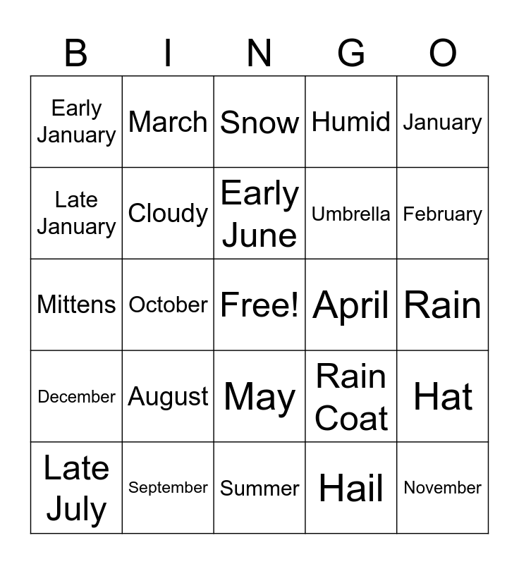 This bingo card has a free space and 24 words: August, September, Early June, Late July, January, Early January, Late January, March, April, May, Umbrella, Mittens, Rain Coat, Hat, Cloudy, Hail, Rain, Snow, February, October, November, December, Humid and Summer.