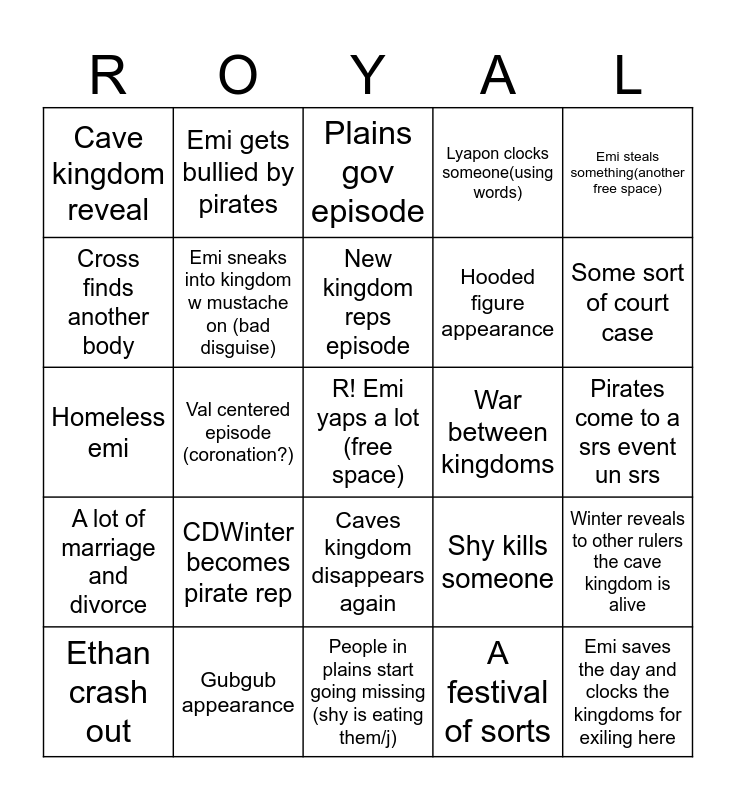 This bingo card has a free space and 24 words: Ethan crash out, CDWinter becomes pirate rep, New kingdom reps episode, A festival of sorts, Emi steals something(another free space), Cave kingdom reveal, Emi gets bullied by pirates, Plains gov episode, War between kingdoms, Pirates come to a srs event un srs, Homeless emi, Emi sneaks into kingdom w mustache on (bad disguise), Shy kills someone, Winter reveals to other rulers the cave kingdom is alive, Cross finds another body, Gubgub appearance, People in plains start going missing (shy is eating them/j), Lyapon clocks someone(using words), Some sort of court case, A lot of marriage and divorce, Val centered episode (coronation?), Caves kingdom disappears again, Hooded figure appearance and Emi saves the day and clocks the kingdoms for exiling here.