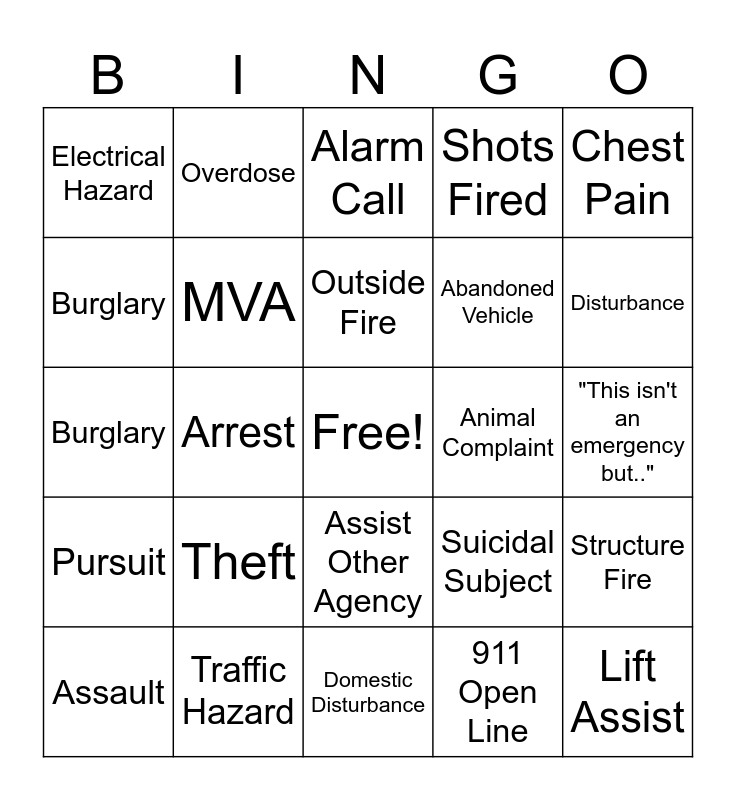 This bingo card has a free space and 29 words: Assault, Suspicious Person, Arrest, Civil Issue, Electrical Hazard, Alarm Call, MVA, Theft, Animal Complaint, Traffic Hazard, "This isn't an emergency but..", Lift Assist, Domestic Disturbance, 911 Open Line, Disturbance, Handle by phone, Assist Other Agency, Pursuit, Chest Pain, Burglary, Suicidal Subject, Traffic Stop, Abandoned Vehicle, Burglary, Shots Fired, Overdose, Structure Fire, Outside Fire and Smoke Investigation.