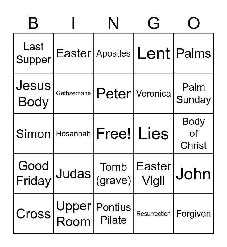 This bingo card has a free space and 29 words: Cross, Crucified, Hosannah, Betrayed, Last Supper, Apostles, Gethsemane, Judas, Lies, Upper Room, Body of Christ, Forgiven, Pontius Pilate, Resurrection, Palm Sunday, Three Days, Tomb (grave), Good Friday, Palms, Simon, Easter Vigil, Barabbas, Veronica, Jesus Body, Lent, Easter, John, Peter and Mary.