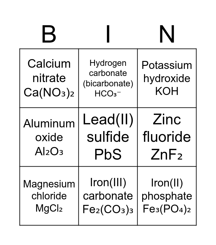 This bingo card has 17 words: Free!, Sodium chloride NaCl, Potassium hydroxide KOH, Calcium nitrate Ca(NO₃)₂, Copper(II) sulfate CuSO₄, Aluminum oxide Al₂O₃, Ammonium sulfate (NH₄)₂SO₄, Magnesium chloride MgCl₂, Iron(III) carbonate Fe₂(CO₃)₃, Zinc fluoride ZnF₂, Barium hydroxide Ba(OH)₂, Silver nitrate AgNO₃, Lead(II) sulfide PbS, Hydrogen carbonate (bicarbonate) HCO₃⁻, Iron(II) phosphate Fe₃(PO₄)₂, Potassium carbonate K₂CO₃ and Calcium phosphate Ca₃(PO₄)₂.