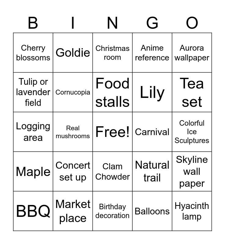 This bingo card has a free space and 24 words: Concert set up, Market place, Food stalls, BBQ, Aurora wallpaper, Cherry blossoms, Tulip or lavender field, Goldie, Carnival, Clam Chowder, Lily, Logging area, Natural trail, Skyline wall paper, Cornucopia, Balloons, Colorful Ice Sculptures, Christmas room, Tea set, Real mushrooms, Hyacinth lamp, Maple, Anime reference and Birthday decoration.