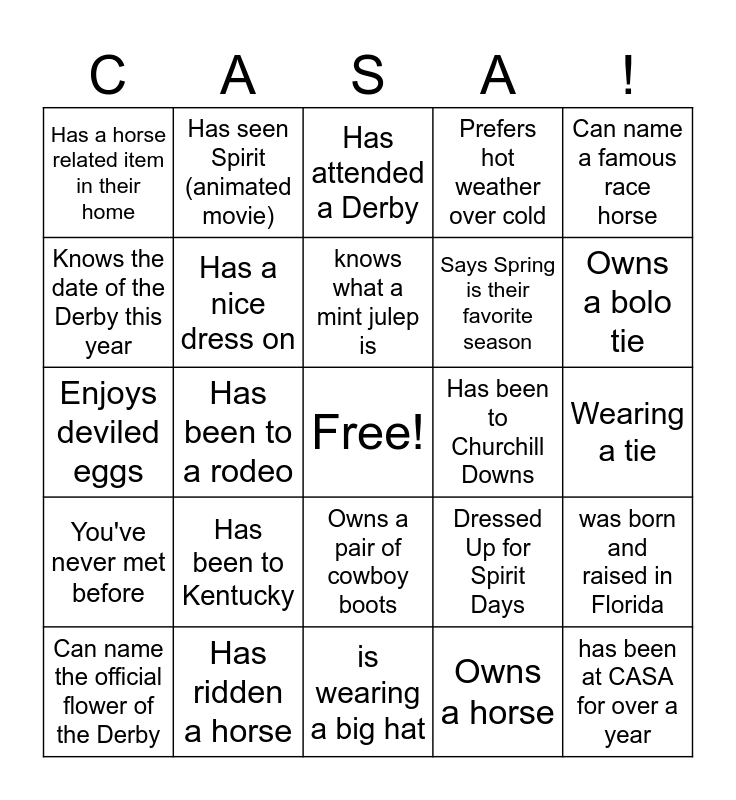 This bingo card has a free space and 24 words: Has been to Kentucky, Has ridden a horse, knows what a mint julep is, Can name the official flower of the Derby, Can name a famous race horse, Has a horse related item in their home, Knows the date of the Derby this year, Has seen Spirit (animated movie), Has been to Churchill Downs, Owns a pair of cowboy boots, Says Spring is their favorite season, Enjoys deviled eggs, Dressed Up for Spirit Days, was born and raised in Florida, Has a nice dress on, Owns a horse, Wearing a tie, Has attended a Derby, Owns a bolo tie, Has been to a rodeo, has been at CASA for over a year, You've never met before, Prefers hot weather over cold and is wearing a big hat.