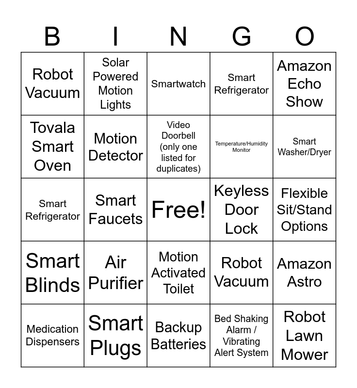This bingo card has a free space and 62 words: Smart Lighting, Smart Plugs, Smart Thermostat, Smart Blinds, Smart Ceiling Fan, Smart Door/Window Sensor, Motion Detector, Water Leak Sensor, Temperature/Humidity Monitor, Voice-Alerting Fire/CO2 Detector, Smart Refrigerator, Induction Stovetop, Tovala Smart Oven, Smart Dishwasher, Smart Washer/Dryer, Robot Vacuum, Robot Lawn Mower, Amazon Echo Show, Google Nest Hub, Video Doorbell (only one listed for duplicates), Keyless Door Lock, Smartwatch, Medication Dispensers, Bed Shaking Alarm / Vibrating Alert System, SAMi Night Monitoring System, Smart Slydr (automatic door opener), Smart Sprinkler Controller, Motion-Activated Toilet, Amazon Astro, Enabot EBO X, Smart Lighting, Smart Plugs, Smart Toothbrush, Smart Blinds, Flexible Sit/Stand Options, Solar Powered Motion Lights, Adaptive Gaming Equipment, Water Leak Sensor, Smart Faucets, Voice-Alerting Fire/CO2 Detector, Smart Refrigerator, Smart Thermostat, Air Purifier, Electric Vehicles, Smart Washer/Dryer, Robot Vacuum, Wheelchair Accessible Sink, Go Green Home Financing, Medical Baseline Program, Video Doorbell, Motion Activated Toilet, Backup Batteries, Medication Dispensers, Bed Shaking Alarm, Toilet Grab Bars, Adaptive Eating Equipment, Smart Sprinkler Controller, Braille Labeler, Text-to-Speech Pen, Induction Stovetop, Personal Alert Necklace and Apple Air Tag.