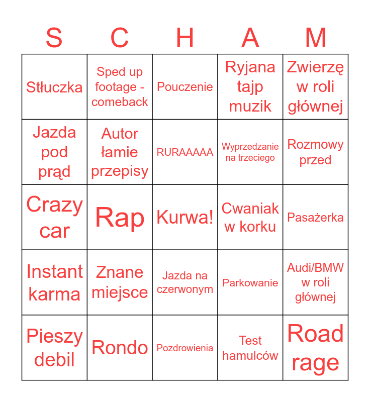 This bingo card has a free space and 37 words: Hamowanie klaksonem, Rikord widio, Brak kierunka, Autor łamie przepisy, Audi/BMW w roli głównej, Znane miejsce, RURAAAAA, Łamanie pierwszeństwa, Zwierzę w roli głównej, Pedalarze, Rap, Ryjana tajp muzik, Road rage, Pasażerka, Jazda pod prąd, Instant karma, Ścięcie pasa, Pouczenie, Jazda na czerwonym, Cwaniak w korku, Stłuczka, Rozmowy przed, Pieszy debil, Pozdrowienia, Wina nagrywającego, Test hamulców, Sped up footage - comeback, Szeryf lewego pasa, Rfm/eska gość gada/dzingiel, Ciemnica, Need for Speed car, Rondo, Crazy car, Pociąg, Parkowanie, Wyprzedzanie na trzeciego and Wyprzedzanie nagrywającego.
