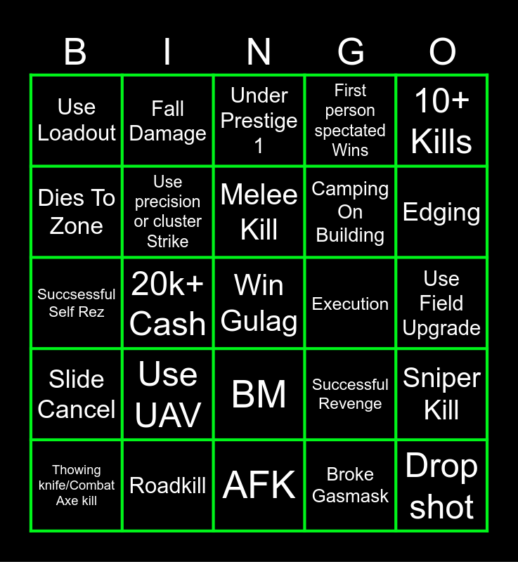 This bingo card has a free space and 24 words: Use UAV, Roadkill, Melee Kill, Thowing knife/Combat Axe kill, 10+ Kills, Use Loadout, Dies To Zone, Fall Damage, Execution, BM, Camping On Building, Succsessful Self Rez, Successful Revenge, Sniper Kill, Use precision or cluster Strike, Broke Gasmask, Use Field Upgrade, Under Prestige 1, Edging, 20k+ Cash, Drop shot, Slide Cancel, First person spectated Wins and AFK.
