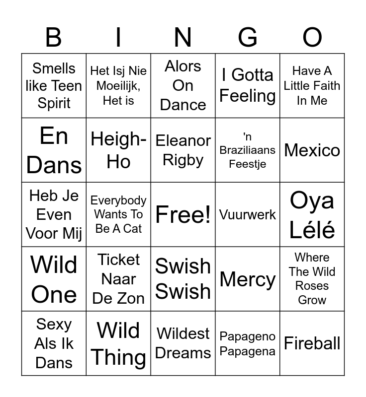 This bingo card has a free space and 75 words: All About The Base, All Summer Long, Alors On Dance, Another Love, Are You Gonna Go My Way, Best Day Of My Live, Budapest, Chasing Cars, De Wereld Is Om Zeep, Diep, Dit Is Wat Mijn Mama Zei, Dos Cervezas, Eleanor Rigby, En Dans, Everybody Loves A Lover, Everybody Wants To Be A Cat, Eviva España, Fireball, FourFiveSeconds, Have A Little Faith In Me, Hé Lekker Beest, Heb Je Even Voor Mij, Heigh-Ho, Het Isj Nie Moeilijk, Het is, I Gotta Feeling, Iedereen Is Van De Wereld, Ik Ben De Sigaar, Ik Ben Verliefd Op Jou, In Mijn Caravan, It's Not Unusual, Je Bent Een Vriend Van Mij, Laat De Zon In Je Hart, Mah Na Mah Na, Mercy, Mexico, 'n Braziliaans Feestje, Never Going Back Again, Oempalapapero, Oya Lélé, Papageno Papagena, Royals, Ruby, Rum And Coca Cola, Saragossa, Se Bastasse una canzone, SEven Nation Army, Sexy Als Ik Dans, Smells like Teen Spirit, Spring, Sweet Caroline, Swentibold, Swish Swish, 't Smidje, Tequila, The Love for 3 Oranges, The Pink Panter Theme, The Way to Your Heart, The Wild Boys, The Wild Places, The Wild Rover, Ticket Naar De Zon, Veranda, Verliefd Op Chris Lomme, Viva La Vida, Vonken En Vuur, Vuurwerk, Walk On The Wild Side, Wannabe, We Are Family, Where The Wild Roses Grow, Wild One, Wild Thing, Wild World, Wildest Dreams and Wildflower.