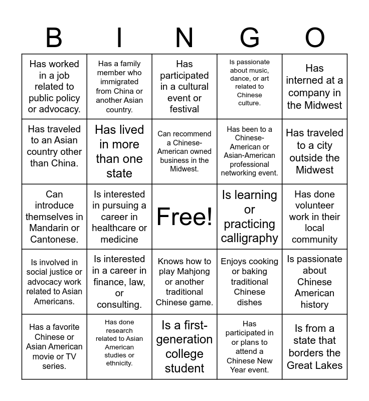 This bingo card has a free space and 31 words: Is a first-generation college student, Speaks more than one language, Is interested in pursuing a career in healthcare or medicine, Is from Chicago or another major Midwestern city, Has worked in a job related to public policy or advocacy., Has participated in a cultural event or festival, Has lived in more than one state, Enjoys cooking or baking traditional Chinese dishes, Is learning or practicing calligraphy, Has participated in or plans to attend a Chinese New Year event., Has done volunteer work in their local community, Is from a state that borders the Great Lakes, Has worked as a teaching assistant or research assistant at their university., Is involved in organizing cultural events or celebrations on campus., Has traveled to a city outside the Midwest, Is involved in a leadership role on campus, Is passionate about Chinese American history, Is interested in a career in finance, law, or consulting., Is involved in social justice or advocacy work related to Asian Americans., Knows how to play Mahjong or another traditional Chinese game., Has interned at a company in the Midwest, Has studied abroad or participated in a cultural exchange, Has a favorite Chinese or Asian American movie or TV series., Has a family member who immigrated from China or another Asian country., Has been to a Chinese-American or Asian-American professional networking event., Has traveled to an Asian country other than China., Is passionate about music, dance, or art related to Chinese culture., Can introduce themselves in Mandarin or Cantonese., Has done research related to Asian American studies or ethnicity., Can recommend a Chinese-American owned business in the Midwest. and Has visited the Midwest’s Chinatown areas (like in Chicago, Cleveland, or Detroit)..