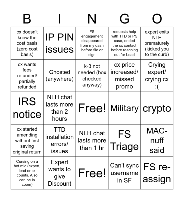 This bingo card has a free space and 24 words: TTD installation errors/ issues, Expert wants to give Discount, k-3 not needed (box checked anyway), Cursing on a hot mic (expert, lead or cx counts. Also can be in zoom), expert exits NLH prematurely (kicked you to the curb), cx doesn't know the cost basis (zero cost basis), cx wants fees refunded/ partially refunded, IP PIN issues, Military, NLH chat lasts more than 1 hr, cx price increased/ missed promo, IRS notice, FS Triage, MAC- nuff said, Ghosted (anywhere), Can't sync username in SF, crypto, FS engagement disappeared from my dash before file or sign, Crying expert/ crying cx :(, NLH chat lasts more than 2 hours, FS re-assign, cx started amending without first saving original return, requests help with TTD or PS case, ended the cx contact before reaching out for Lead and Free!.