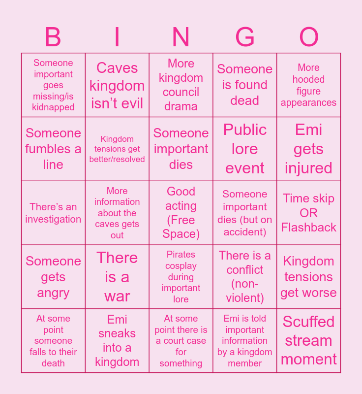 This bingo card has a free space and 24 words: There is a war, Emi sneaks into a kingdom, Someone important dies, At some point someone falls to their death, More hooded figure appearances, Someone important goes missing/is kidnapped, Someone fumbles a line, Caves kingdom isn’t evil, Someone important dies (but on accident), Pirates cosplay during important lore, Public lore event, There’s an investigation, There is a conflict (non-violent), Kingdom tensions get worse, Kingdom tensions get better/resolved, Emi is told important information by a kingdom member, Time skip OR Flashback, More kingdom council drama, Emi gets injured, More information about the caves gets out, Scuffed stream moment, Someone gets angry, Someone is found dead and At some point there is a court case for something.
