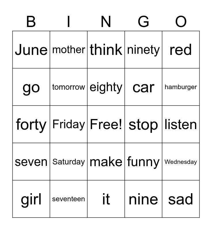 This bingo card has a free space and 126 words: one, two, three, four, five, six, seven, eight, nine, ten, eleven, twelve, thirteen, fourteen, fifteen, sixteen, seventeen, eighteen, nineteen, twenty, thirty, forty, fifty, sixty, seventy, eighty, ninety, one hundred, Monday, Tuesday, Wednesday, Thursday, Friday, Saturday, Sunday, January, February, March, April, May, June, July, August, September, October, November, December, red, blue, green, yellow, black, white, pink, purple, orange, brown, read, write, stop, go, close, open, start, stop, take, give, make, watch, listen, see, look, answer, run, walk, book, desk, chair, door, pencil, paper, backpack, man, woman, girl, boy, he, she, it, tell, eat, sleep, today, tomorrow, yesterday, think, hear, see, play, happy, sad, angry, funny, water, lunch, breakfast, dinner, food, hamburger, fries, pizza, taco, burrito, apple, grapes, banana, pineapple, lemon, dog, cat, car, bus, school, teacher, mother and father.