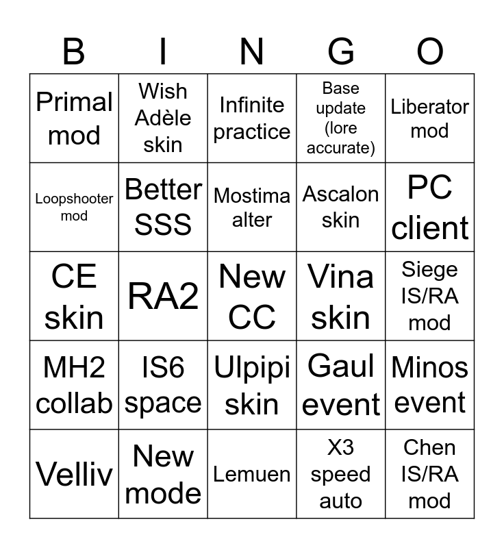 This bingo card has 25 words: IS6 space, Lemuen, Mostima alter, Velliv, Liberator mod, Primal mod, Loopshooter mod, Wish Adèle skin, Vina skin, Ulpipi skin, Ascalon skin, CE skin, Gaul event, Minos event, Better SSS, Chen IS/RA mod, Siege IS/RA mod, Infinite practice, PC client, RA2, New CC, New mode, MH2 collab, Base update (lore accurate) and X3 speed auto.