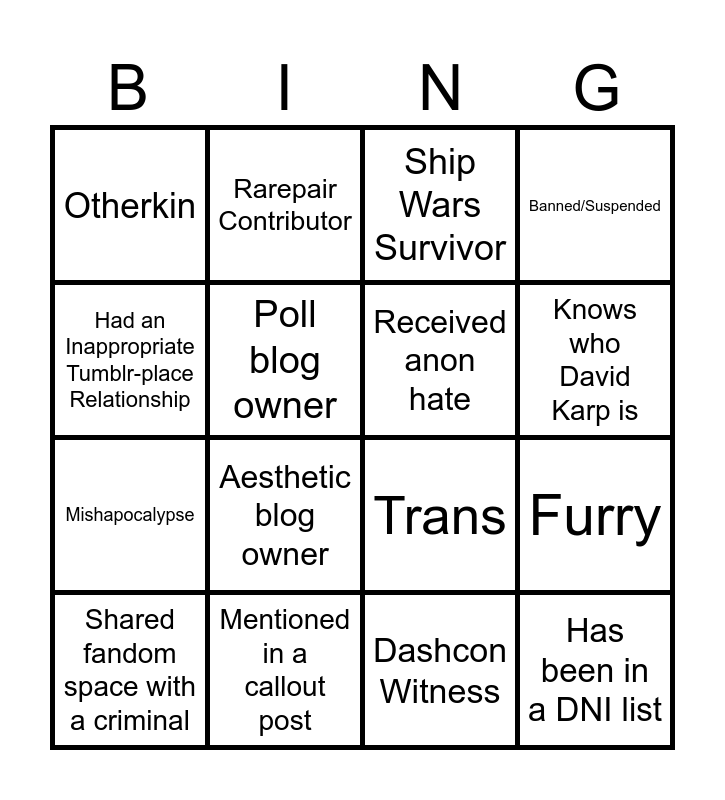 This bingo card has 16 words: Shared fandom space with a criminal, Mentioned in a callout post, Ship Wars Survivor, Banned/Suspended, Had an Inappropriate Tumblr-place Relationship, Rarepair Contributor, Trans, Furry, Otherkin, Poll blog owner, Dashcon Witness, Knows who David Karp is, Mishapocalypse, Aesthetic blog owner, Received anon hate and Has been in a DNI list.