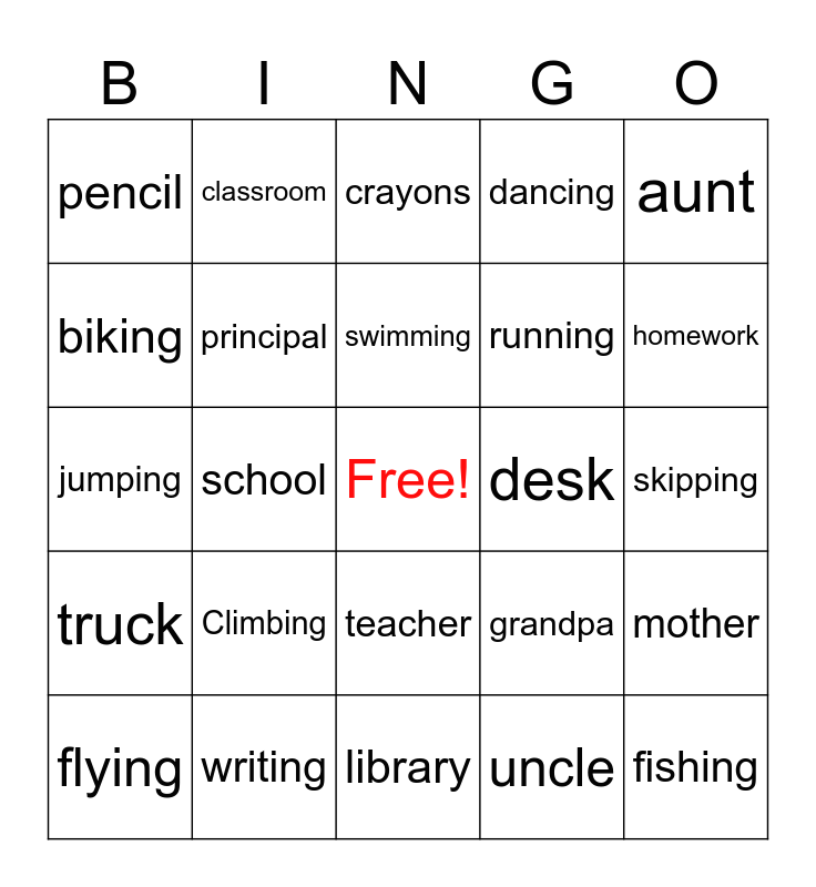 This bingo card has a free space and 24 words: Climbing, writing, swimming, flying, aunt, pencil, biking, classroom, desk, teacher, running, jumping, grandpa, mother, principal, uncle, skipping, crayons, homework, school, fishing, truck, dancing and library.