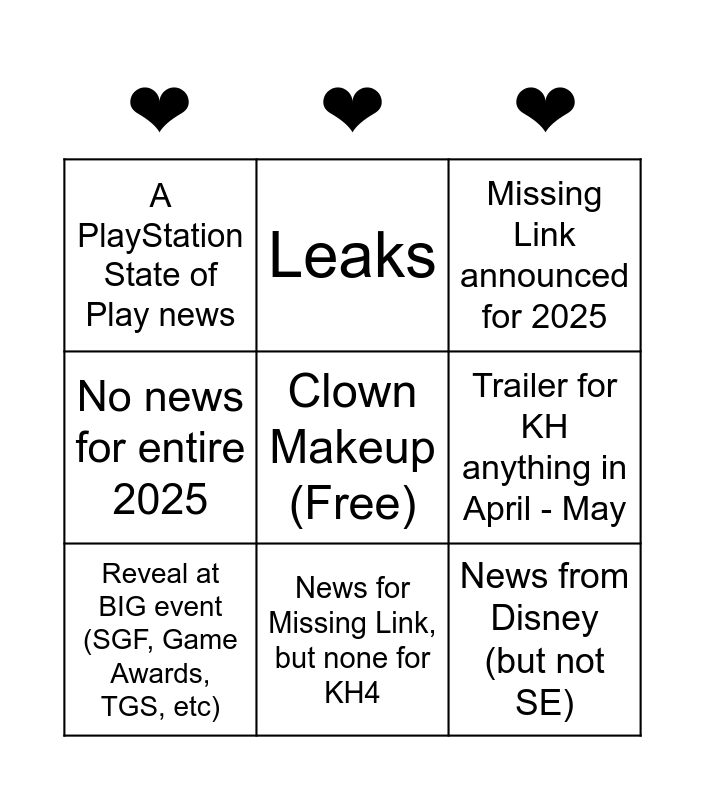 This bingo card has a free space and 8 words: Trailer for KH anything in April - May, Missing Link announced for 2025, Leaks, Reveal at BIG event (SGF, Game Awards, TGS, etc), A PlayStation State of Play news, News from Disney (but not SE), No news for entire 2025 and News for Missing Link, but none for KH4.