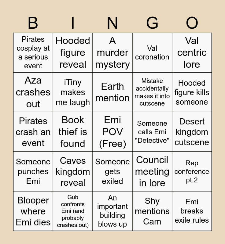 This bingo card has a free space and 24 words: Caves kingdom reveal, Gub confronts Emi (and probably crashes out), Earth mention, Blooper where Emi dies, Val centric lore, Pirates cosplay at a serious event, Aza crashes out, Hooded figure reveal, Someone calls Emi "Detective", Someone gets exiled, Mistake accidentally makes it into cutscene, Pirates crash an event, Council meeting in lore, Rep conference pt.2, iTiny makes me laugh, Shy mentions Cam, Desert kingdom cutscene, A murder mystery, Hooded figure kills someone, Book thief is found, Emi breaks exile rules, Someone punches Emi, Val coronation and An important building blows up.