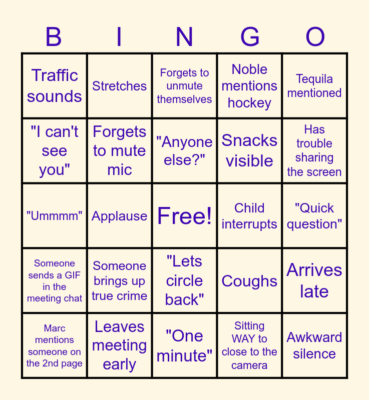 This bingo card has a free space and 27 words: Coughs, Marc mentions Miles, Snacks visible, "One minute", "I can't see you", Forgets to unmute themselves, Stretches, Someone sends a GIF in the meeting chat, Child interrupts, Arrives late, "Ummmm", Noble mentions hockey, Marc mentions someone on the 2nd page, Leaves meeting early, Has trouble sharing the screen, Drops something, Forgets to mute mic, "Anyone else?", Someone brings up true crime, Traffic sounds, "Quick question", Sitting WAY to close to the camera, Applause, Awkward silence, "Lets circle back", Tequila mentioned and "Whats on the agenda today?".