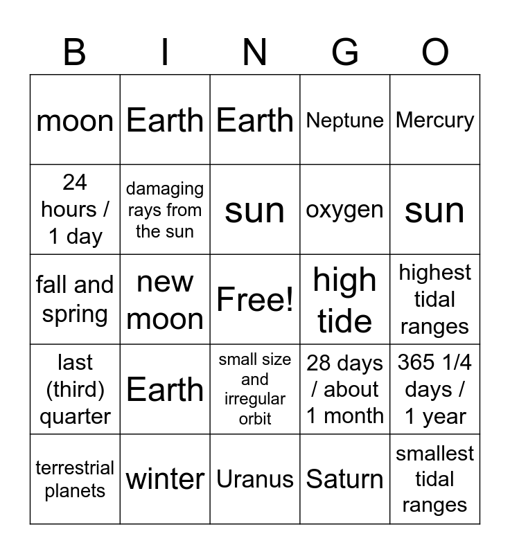 This bingo card has a free space and 39 words: The phases of the moon are responsible for the changes in tidal range, gas giants, new moon, damaging rays from the sun, terrestrial planets, small size and irregular orbit, sun, summer, Mercury, last (third) quarter, new moon, Neptune, smallest tidal ranges, highest tidal ranges, high tide, Earth, revolution, moon, low tide, 28 days / about 1 month, 24 hours / 1 day, Uranus, oxygen, sun, Jupiter, rotation, Earth's tilt on its axis as it revolves around the sun, Mars, first quarter, Earth, day and night, Venus, Earth, winter, Saturn, full moon, 365 1/4 days / 1 year, fall and spring and the position of the moon relative to the Earth and the sun and the reflection of sunlight off the moon's surface.