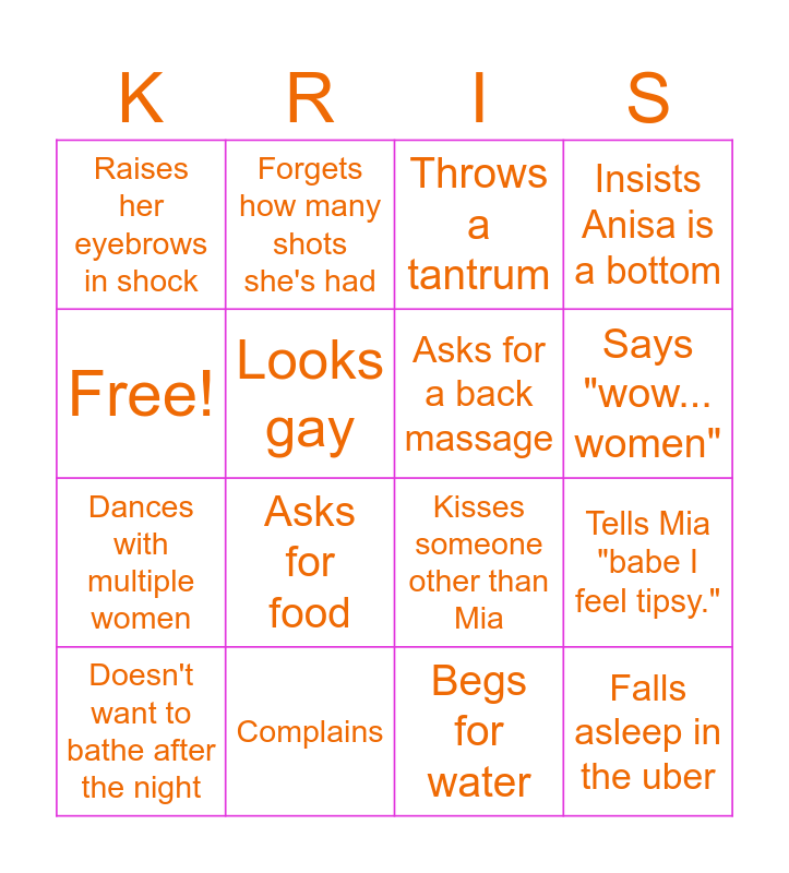 This bingo card has 16 words: Complains, Tells Mia "babe I feel tipsy.", Throws a tantrum, Raises her eyebrows in shock, Dances with multiple women, Forgets how many shots she's had, Kisses someone other than Mia, Begs for water, Free!, Looks gay, Doesn't want to bathe after the night, Insists Anisa is a bottom, Asks for food, Says "wow... women", Asks for a back massage and Falls asleep in the uber.