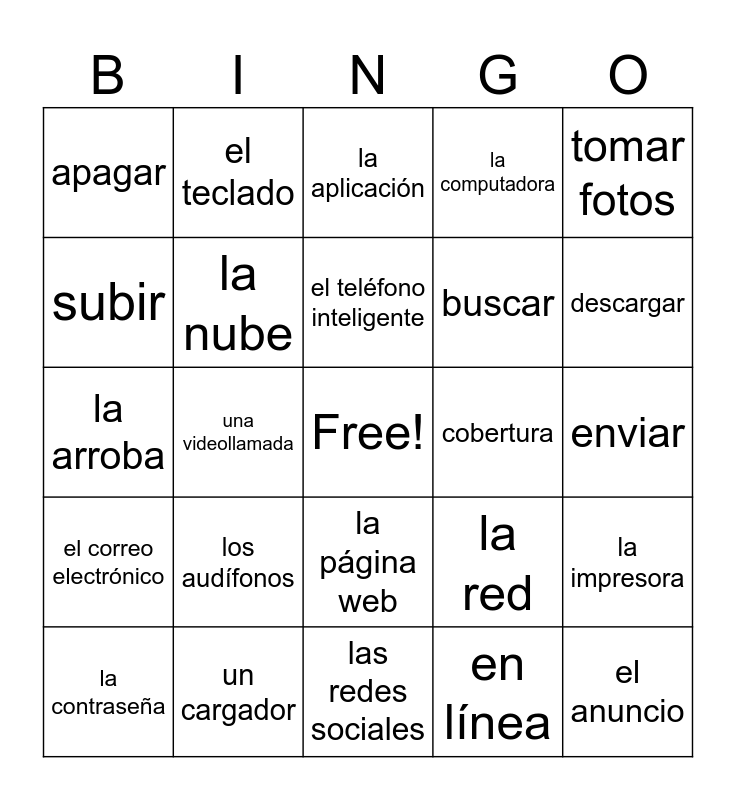 This bingo card has a free space and 29 words: la contraseña, una publicación, una videollamada, ecender, apagar, la aplicación, la nube, los audífonos, cobertura, un cargador, enviar, el anuncio, las redes sociales, en línea, descargar, el enlace, la página web, el correo electrónico, tomar fotos, la arroba, la red, la pantalla, buscar, subir, la computadora, el teclado, la impresora, el teléfono inteligente and guardar.