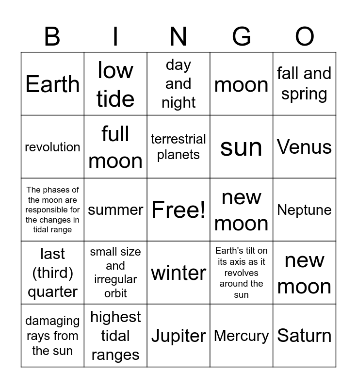 This bingo card has a free space and 39 words: high tide, 365 1/4 days / 1 year, sun, full moon, damaging rays from the sun, winter, terrestrial planets, first quarter, fall and spring, last (third) quarter, summer, moon, Saturn, Neptune, new moon, small size and irregular orbit, Earth, Earth, 28 days / about 1 month, Earth's tilt on its axis as it revolves around the sun, revolution, Jupiter, sun, Venus, oxygen, 24 hours / 1 day, rotation, Mars, smallest tidal ranges, low tide, Earth, Uranus, day and night, highest tidal ranges, Mercury, the position of the moon relative to the Earth and sun and the reflection of sunlight off the moon's surface, new moon, The phases of the moon are responsible for the changes in tidal range and gas giants.